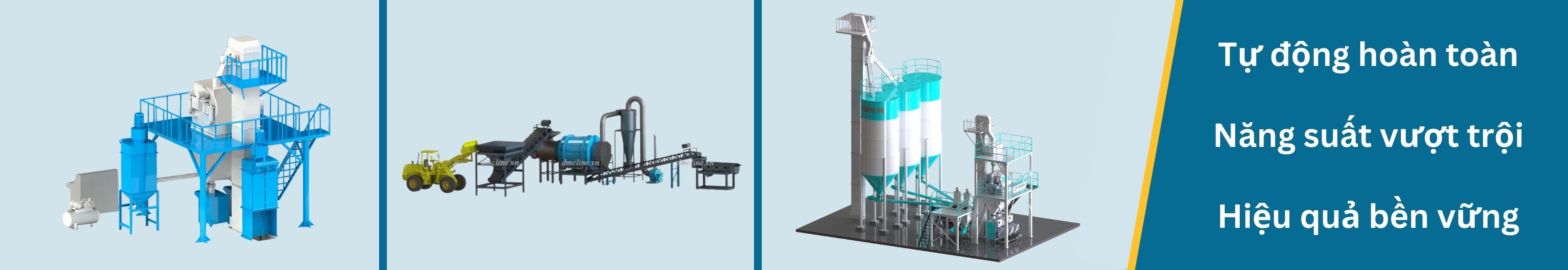 Dây chuyền sản xuất vữa khô tự động hoàn toàn. Công suất 10-30 tấn/giờ. Chỉ 2-4 công nhân vận hành. Thiết kế theo yêu cầu khách hàng, sản phẩm đa dạng.